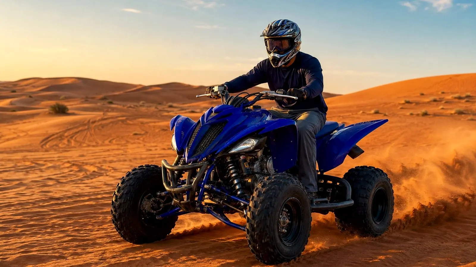 Yamaha 220cc / 400cc / Grizzly. 1-2 hour rides. Wide tracks, mid-size dunes. Half-day from Dubai (4-5 hours total).