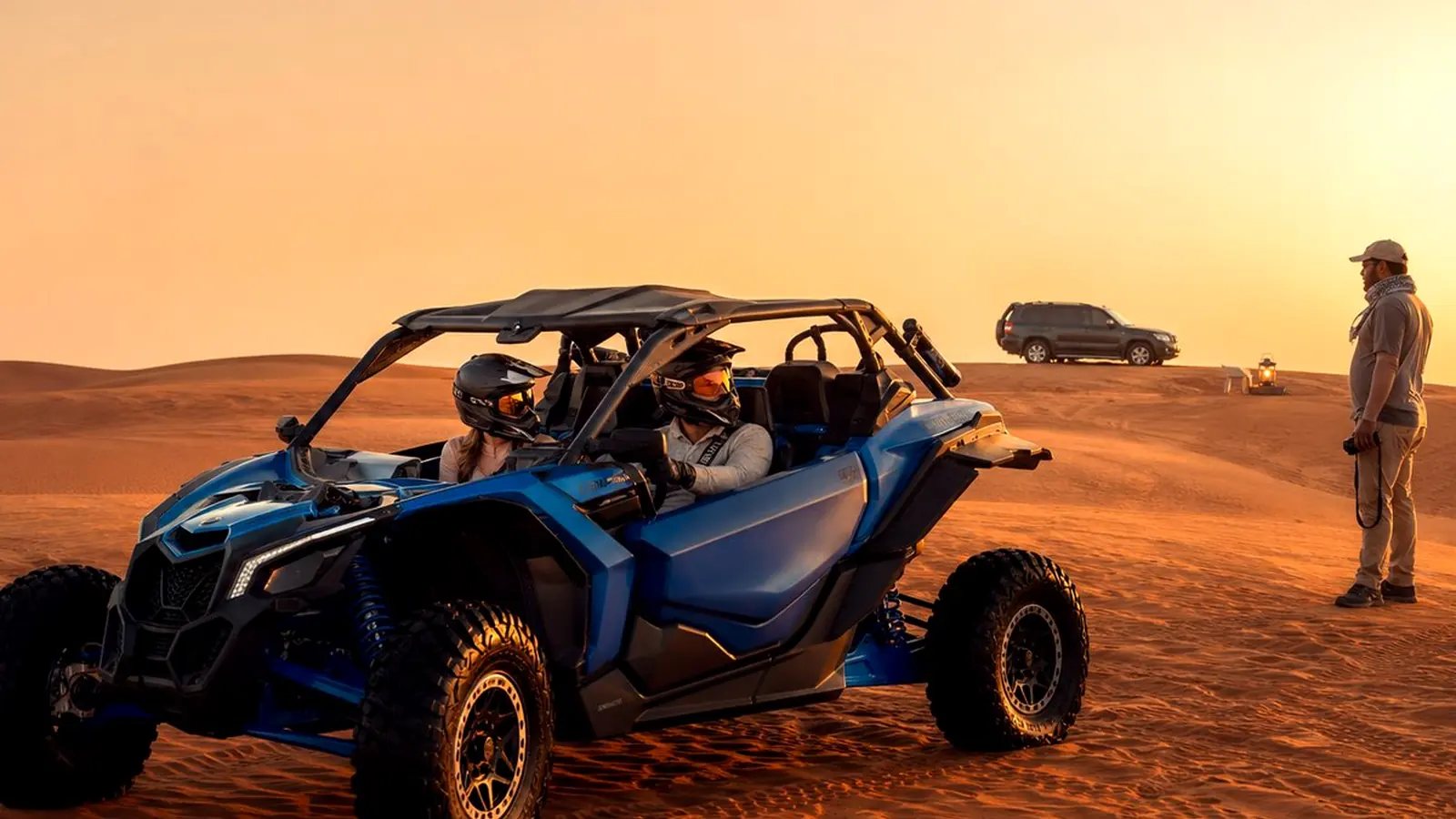 Self-drive desert sessions suit guests 18+ (buggy driver), 13+ (quad rider on 220cc), 16+ (quad rider on 400cc and above), with comfort holding throttle and steering controls. Automatic transmission across the buggy fleet — no manual gearbox required. Lead-guide convoy means even first-timers feel comfortable inside the first 5–10 minutes.