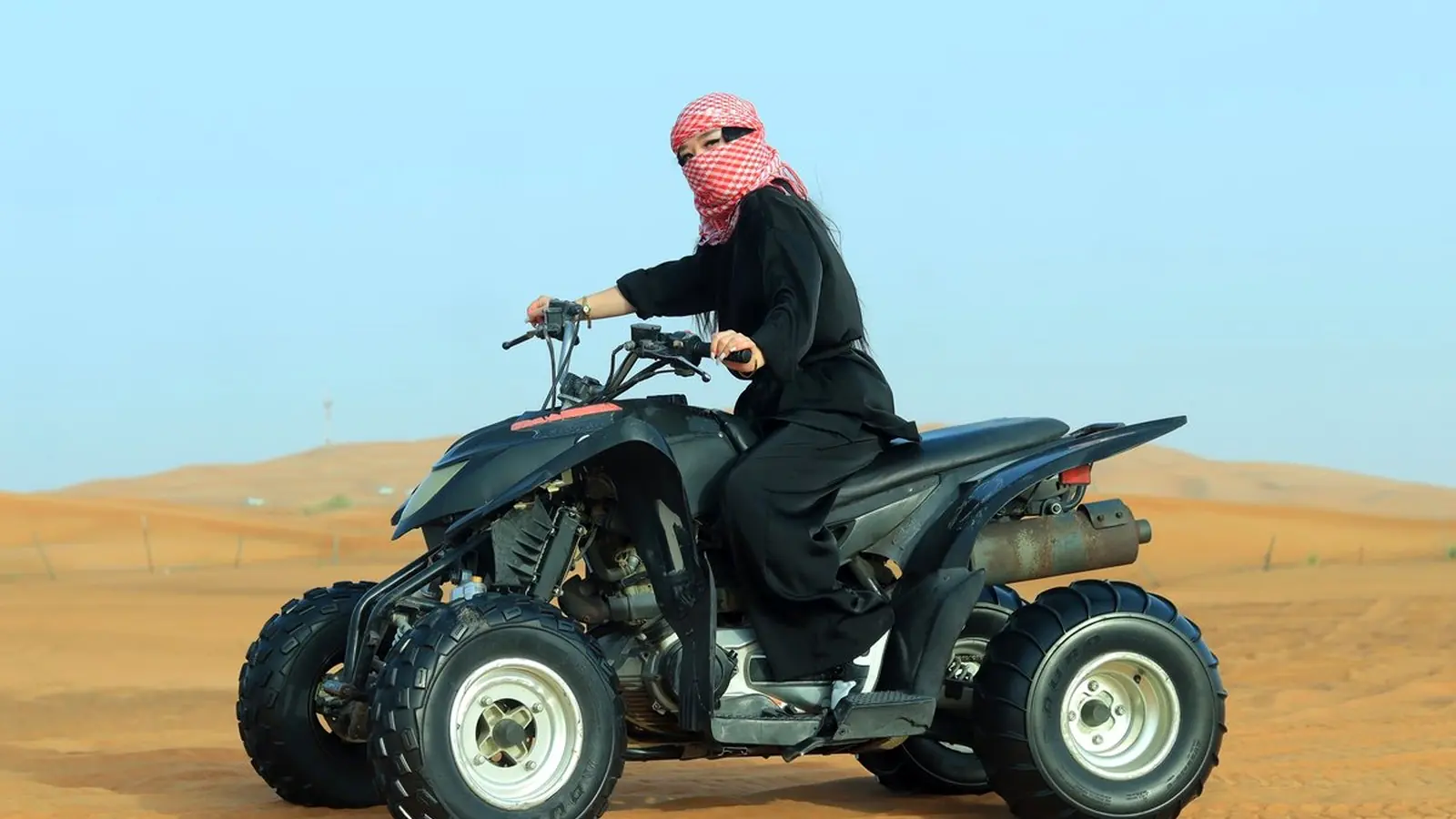 Self-drive desert sessions suit guests 18+ (buggy driver), 13+ (quad rider on 220cc), 16+ (quad rider on 400cc and above), with comfort holding throttle and steering controls. Automatic transmission across the buggy fleet — no manual gearbox required. Lead-guide convoy means even first-timers feel comfortable inside the first 5–10 minutes.